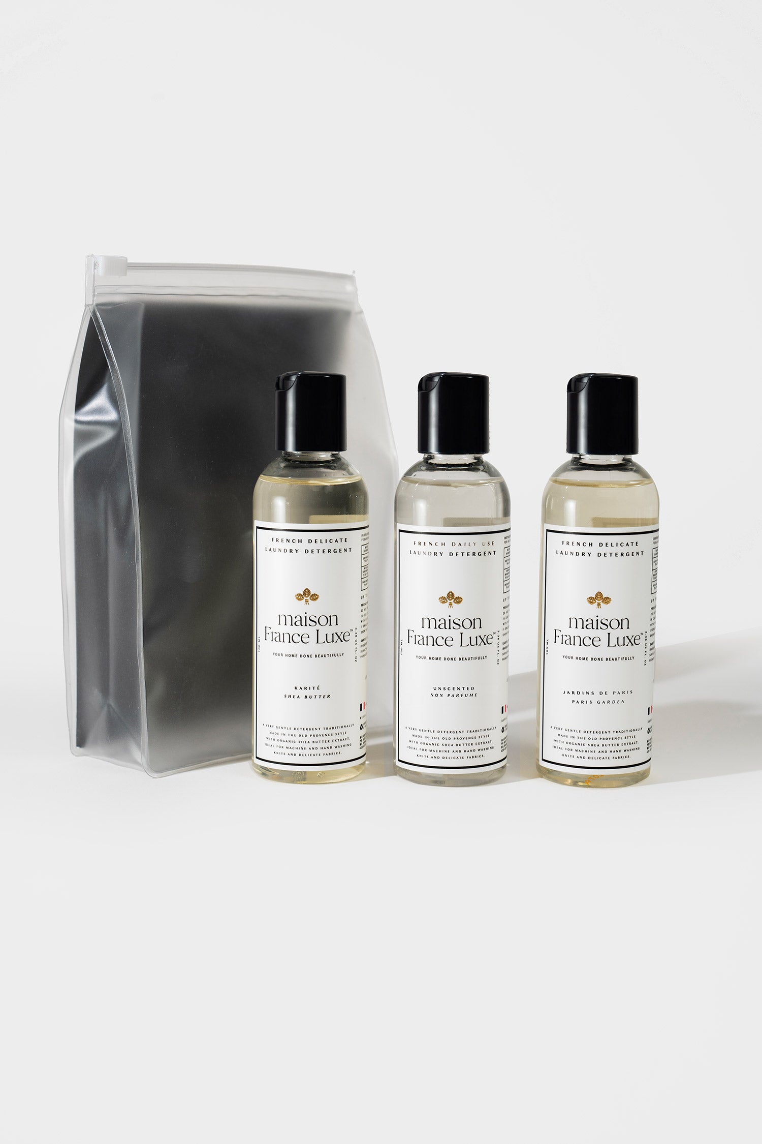 Indulge in the art of fine laundry care with the Maison France Luxe Luxe Laundry Trio, a travel-size sampler of our luxurious, artisan-crafted French laundry detergents. Made in small batches using the traditional Provence method, this plant-based formula blends natural coconut and olive oils, ensuring a gentle yet effective cleanse that nourishes fabric fibers while washing.